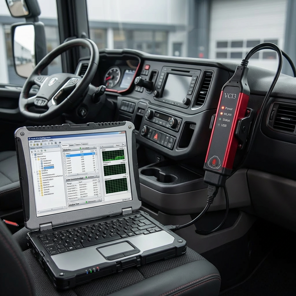 Full diagnostics of every module including engine, gearbox, retarder, emission systems, body modules, and 4×4 systems. Perfect for workshops maintaining modern fleets.
